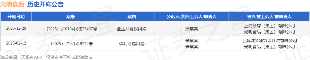 依据计算,近一年内以光亮食物(集团)有限公司为当事人的前史开庭公告有2则,其间案由为“业主共有权胶葛”的公告以1则居首,其次为“福利待遇胶葛”有1则。前史开庭公告如下: